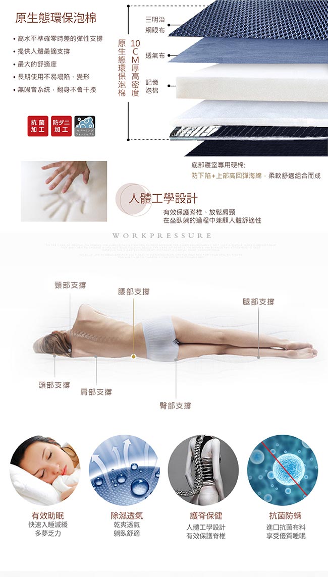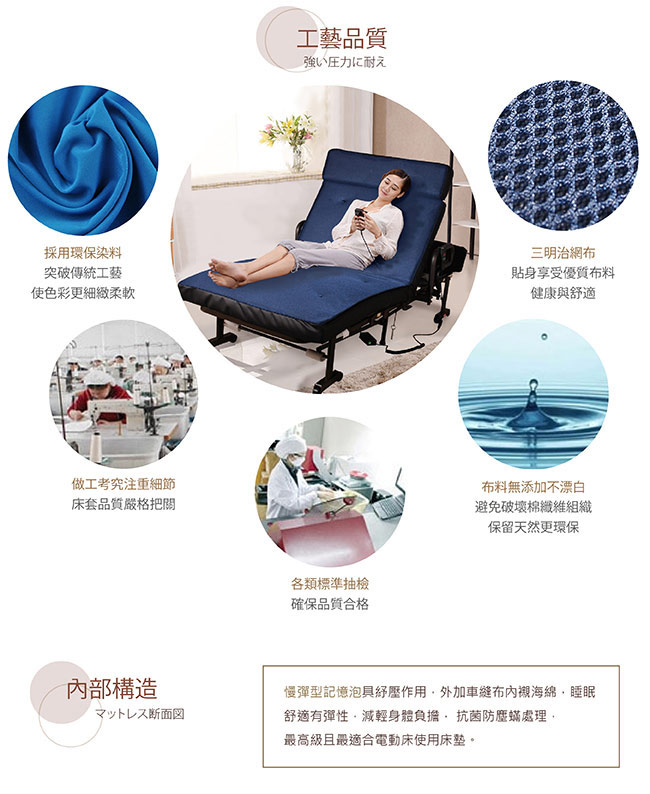 究極細膩的外銷日本歐美品質,創造舒適的高品質睡眠環境,產品開發的基礎是一種以人為本的理念,通過瞄準新的和獨特的想法提供豐富產品的新鮮度。究極細膩的專業研發團隊,創造極舒適的高品質睡眠環境,生活中的藝術敏銳度和創造性,提升高齡者與行動不便者及文明病腰痠背痛者的生活品質。有效支撐人體,並分散壓力,堅穩承托、極致放鬆,使居家生活品質大為提升。