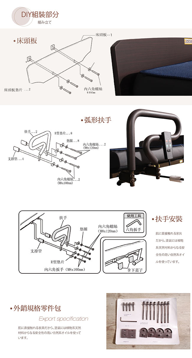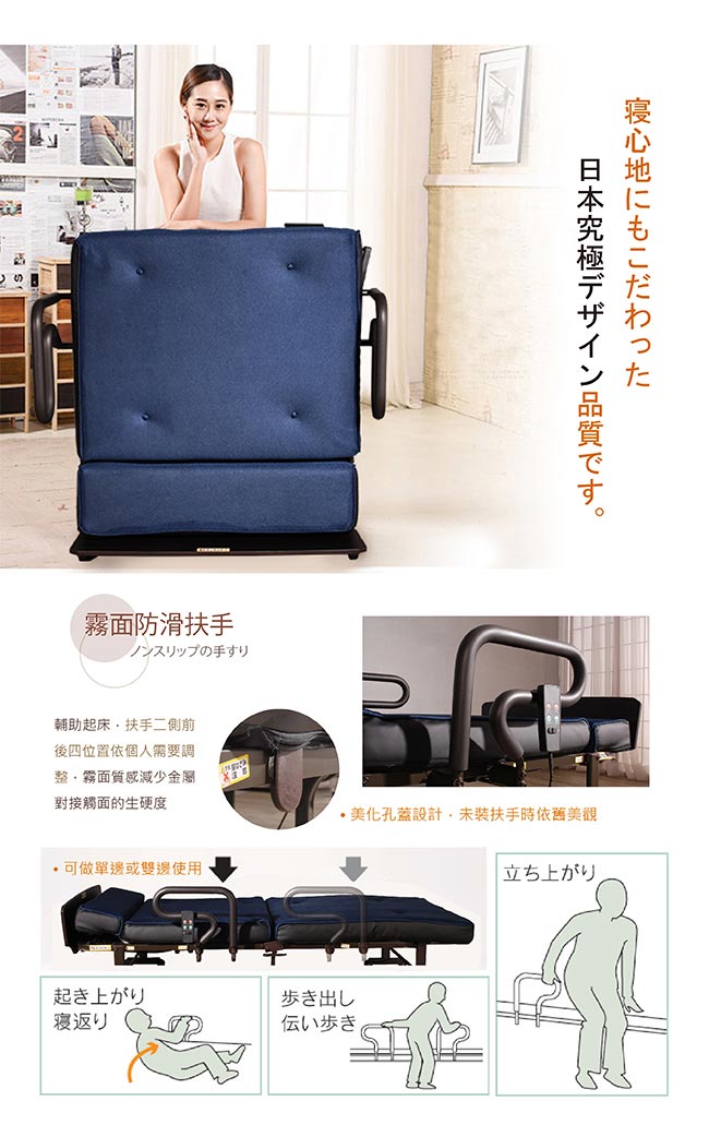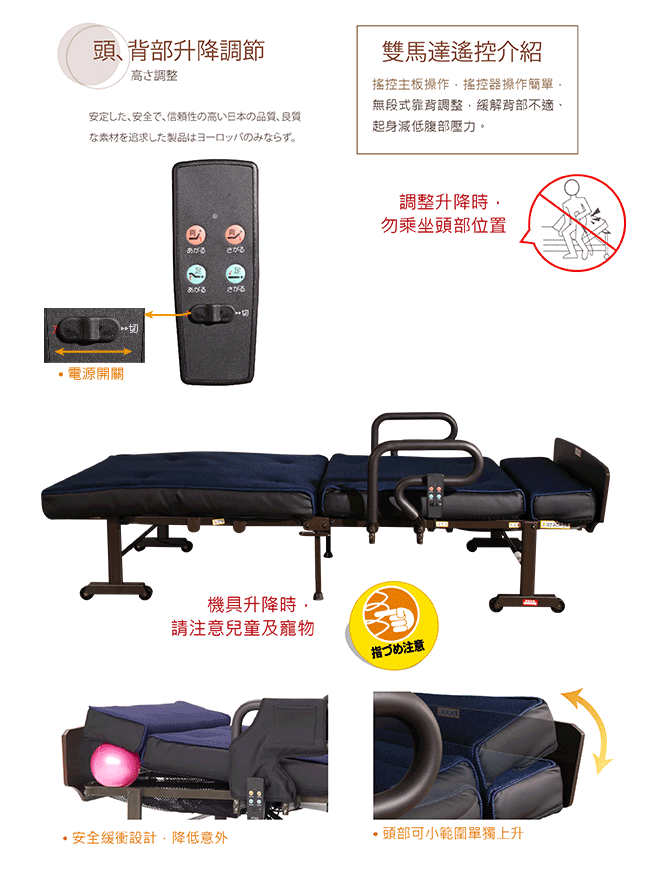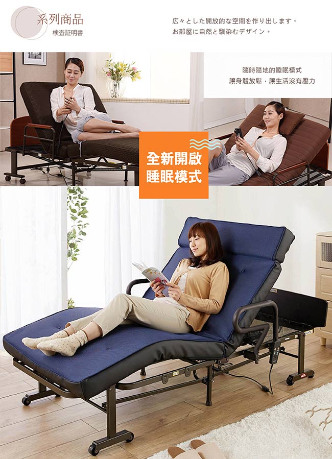 暢銷日本歐美,品質檢驗符合UL認證(美國)、CUL認證(加拿大)、EMC認證、PSE認證,加寬尺寸幅95cm符合人體工學,採用外銷日本電機,通過SGS認證,頭部,腳部傾仰。搖控主板操作,搖控器操作簡單,無段式靠背調整傾仰80°緩升緩降,緩解背部不適、起身減低腹部壓力,減輕腿部腫脹感。高密度波浪型泡綿、加厚高達10cm按摩作用,透氣彈力布,表面不起皺折,透氣、易整理,軟體泡綿扶手可檔棉被滑落地面,睡眠舒適有彈性符合人體工學,貼身個人化舒眠,輕便好收合,睡眠時床體不易滑動,貼心安全金屬插銷,收合後使固定安全,貼有防夾手警示標。
