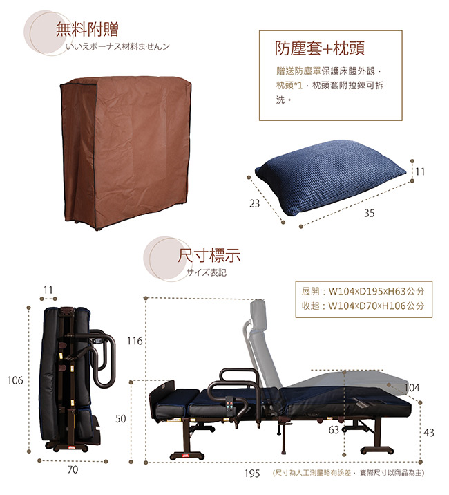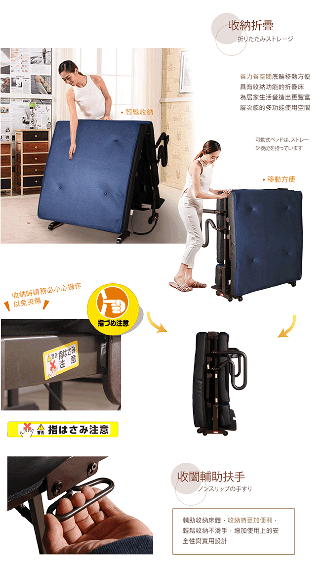 床體金屬鋼管採無鉛粉體噴漆,品質通過嚴格的國際檢驗,腳輪採用360度地球輪,滑動更自如輕便(附塑質安全防滑煞車套),安全金屬插銷,收合後使固定安全。床底網狀鋼管無毒粉體塗裝,黑色的床體結構搭配床套深藍色自然而紓壓,安心信賴的日本品質,贈送防塵罩保護床體外觀,收合後保護床體無灰塵;贈送枕頭*1,枕頭套附拉鍊可拆洗。居家親戚朋友來訪、做為陪伴床均適合,具有收納功能的折疊床,為居家生活營造出更豐富與層次感的多功能使用空間。黑色烘托出卓越的機能床表現,歐風自然舖陳出溫柔觸感,蔓延舒適夢境。
