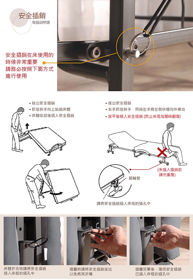 2. 床折疊的時候:折疊時請將插銷拔出,以免將其折彎